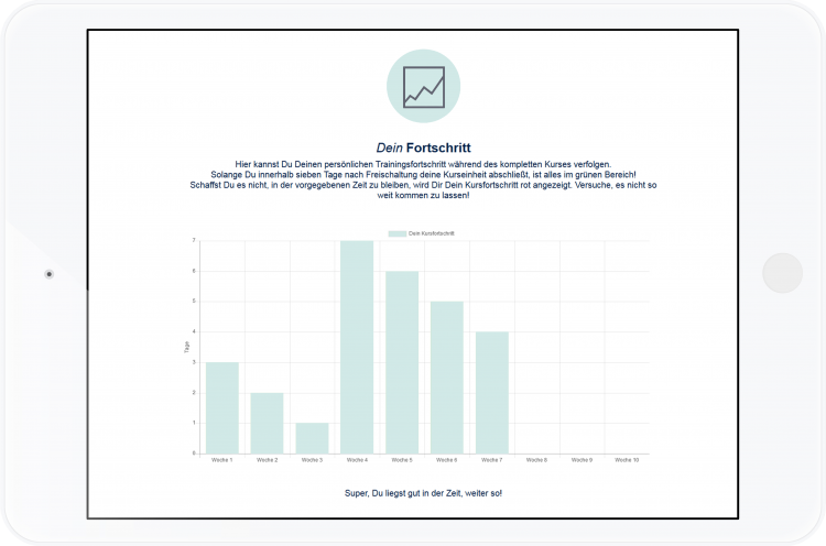 Während des Kurses kannst Du Deinen Trainingsfortschritt jederzeit sehen und abrufen. Nach jeder Trainingseinheit steht Dir eine aktuelle Auswertung auf Deinem persönlichen Dashboard zur Verfügung. Daran kannst Du erkennen, ob Du alle Yogaübungen und Trainingseinheiten in der vorgesehenen Zeit geschafft hast.